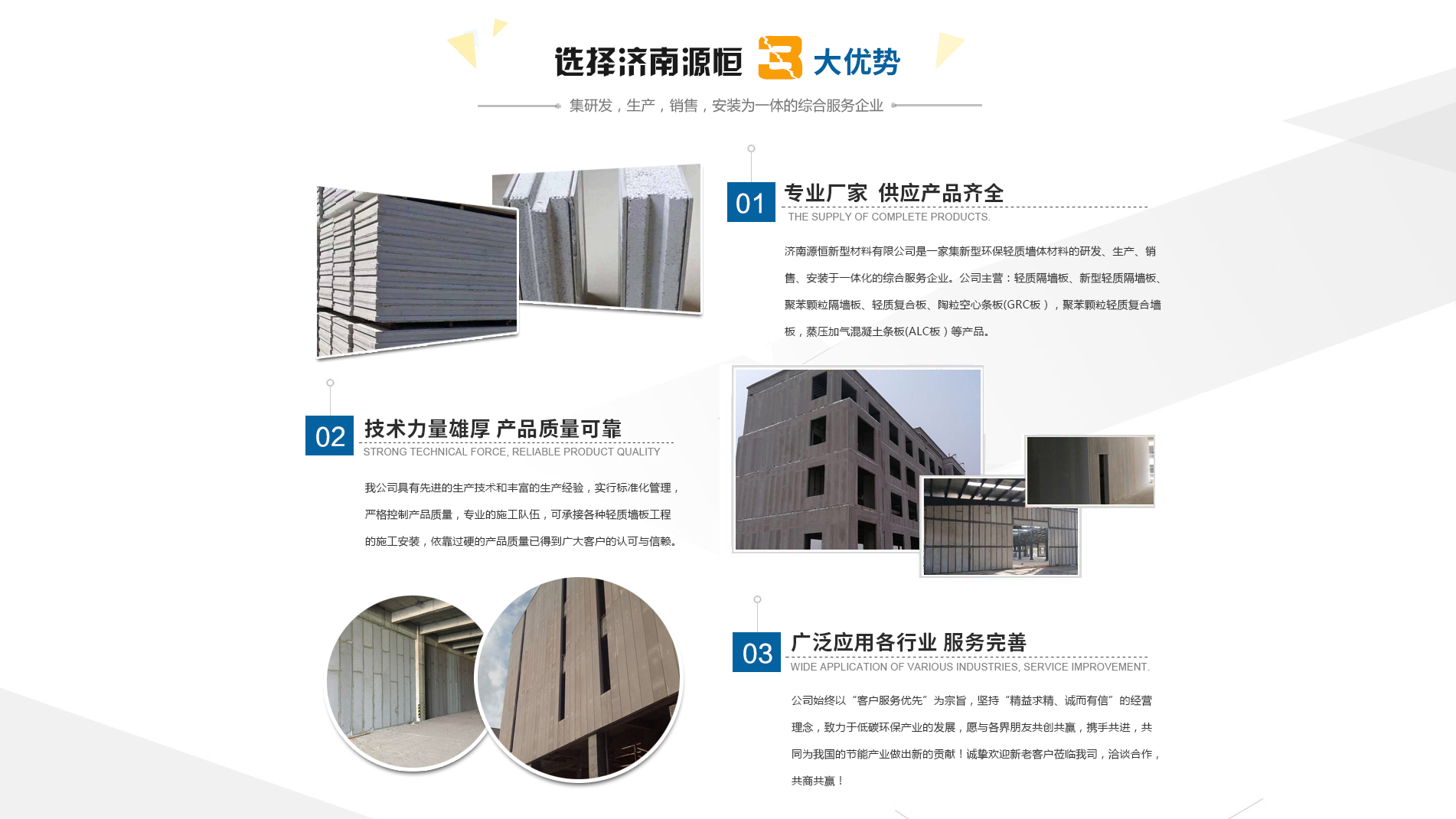 濟(jì)南源恒新型材料有限公司坐落于美麗的泉城濟(jì)南,是集新型環(huán)保輕質(zhì)墻體材料的研發(fā)、生產(chǎn)、銷售、安裝于一體化的綜合服務(wù)企業(yè)。我公司具有的生產(chǎn)技術(shù)和豐富的生產(chǎn)經(jīng)驗(yàn),為您提供輕質(zhì)隔墻板、新型輕質(zhì)隔墻板、聚苯顆粒隔墻板、輕質(zhì)復(fù)合板、陶??招臈l板(GRC板),聚苯顆粒輕質(zhì)復(fù)合墻板,蒸壓加氣混凝土條板(ALC板)等產(chǎn)品,本公司有專的施工隊(duì)伍,可承接各種輕質(zhì)墻板工程的施工安裝。輕質(zhì)隔墻板是國(guó)家推廣使用的新型輕質(zhì)、綠色無害建材,是墻改節(jié)能政策大力扶持的環(huán)保節(jié)能產(chǎn)品,是發(fā)達(dá)國(guó)家普遍采用的新型墻體材料。濟(jì)南源恒新型材料有限公司實(shí)行標(biāo)準(zhǔn)化管理,嚴(yán)格控制產(chǎn)品質(zhì)量,依靠過硬的產(chǎn)品質(zhì)量已得到廣大客戶的認(rèn)可與信賴。公司產(chǎn)品遍布各大城市,與國(guó)內(nèi)多家客戶建立了良好的合作關(guān)系。公司始終以“客戶服務(wù)優(yōu)先”為宗旨,堅(jiān)持“精益求精、誠(chéng)而有信”的經(jīng)營(yíng)理念,致力于低碳環(huán)保產(chǎn)業(yè)的發(fā)展,愿與各界朋友共創(chuàng)共贏,攜手共進(jìn),共同為我國(guó)的節(jié)能產(chǎn)業(yè)做出新的...